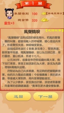 每答对一个成语,画面中会弹出一个该成语的简单解释。每通过一关,后面会有一个成语故事。使用户在游戏里面也学习到了不少成语知识和典故。