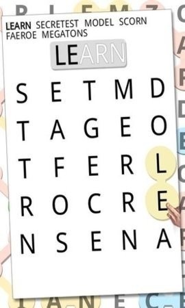 找单词属于益智类型的手游没什么难度,就是比较考验用户的眼力劲,只要认识二十六个英文字母就OK。在游戏里玩家需要做的是将手游给出的一个单词,从下面将字母找出,并且用户要不能中断,一次画出连成一个单词才可以,把所有单词都找出就可以到下一关啦。