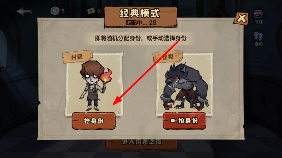 2.点击进入猎杀之夜,在经典模式匹配界面,可选择手动抢身份,扮演村民或怪物,若不手动选择则将随机分配身份。
