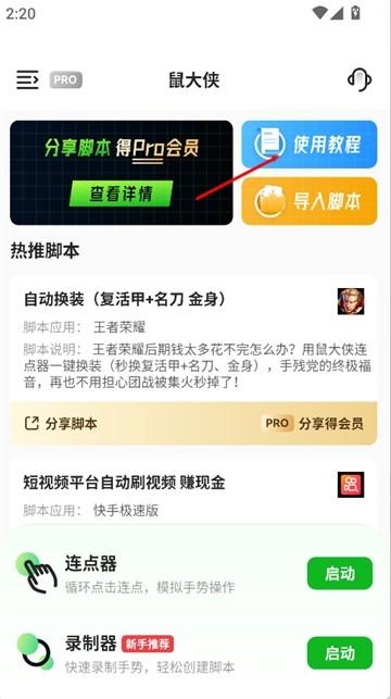 1、完成登录后进入鼠大侠连点器主界面,点击“使用教程”按钮,进入功能说明页面查看操作指引。