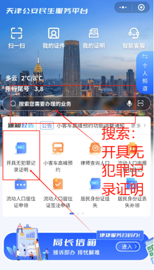 1、在本站下载安装天津公安民生服务平台app,来到首页,点击开具无犯罪记录证明
