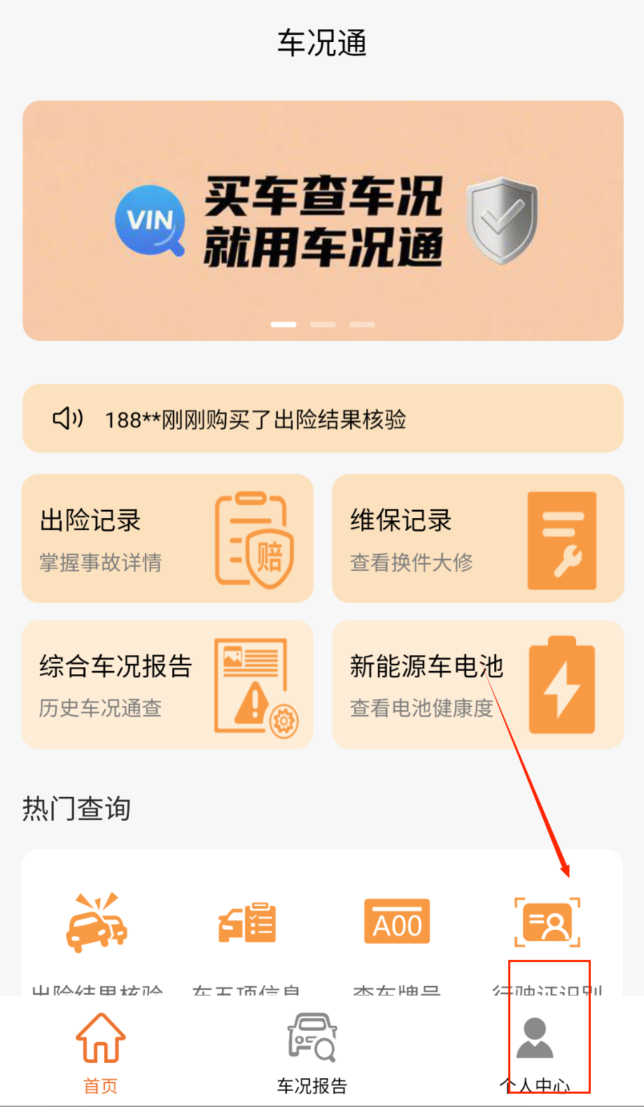 1、打开车况通app并进入查询界面,输入待查车辆的车架号等信息,系统将自动调取该车的出险、维保、投保和过户记录。