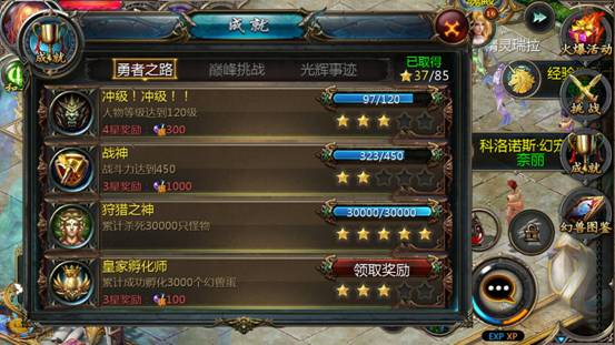 “勇者之路”的成就达成难度较低,比如之前提到的“狩猎之神”就是“勇者之路”分支下的成就之一。“勇者之路”下的每个成就都分为五个阶段,每完成1个阶段,该成就就点亮1星,同时进度条也会变成领取奖励按钮,点击它可以使你获得成就中所描述的该星成就奖励:比如图中的狩猎之神1星奖励就是10点绑定魔石。