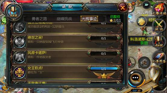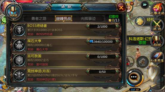 成就系统目前共有三个分支,分别为“勇者之路”、“巅峰挑战”和“光辉事迹”。顾名思义,这三个分支下的成就达成难度是有区别的。
