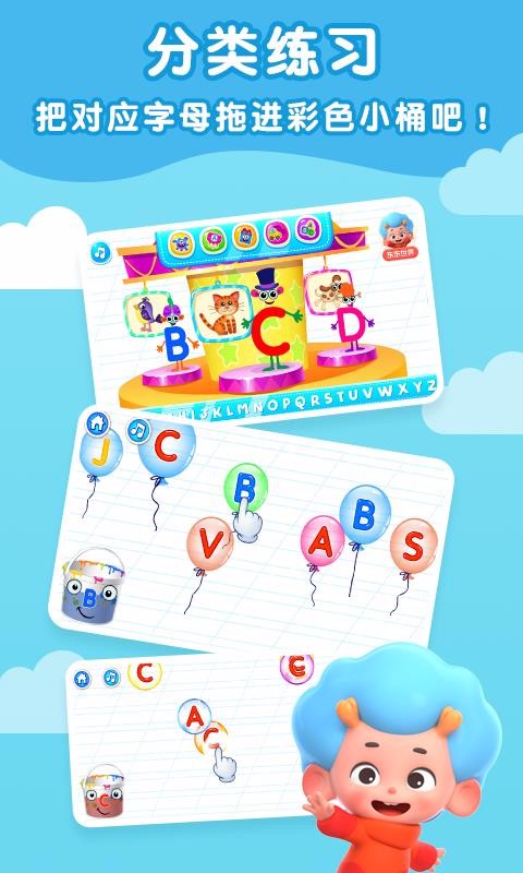 1、将字母对应的彩色气球拖入小桶,在气球认字练习中,了解更多字母。