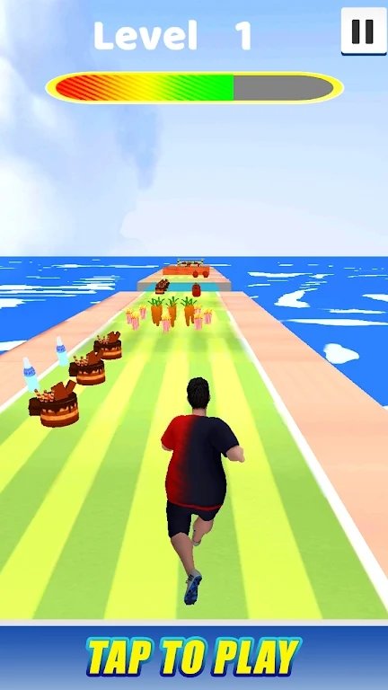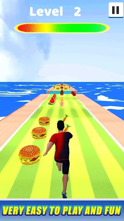 2、玩家在关卡中是需要不断的去吃各种食物来增加体重,而且跑步会消耗你的体重。