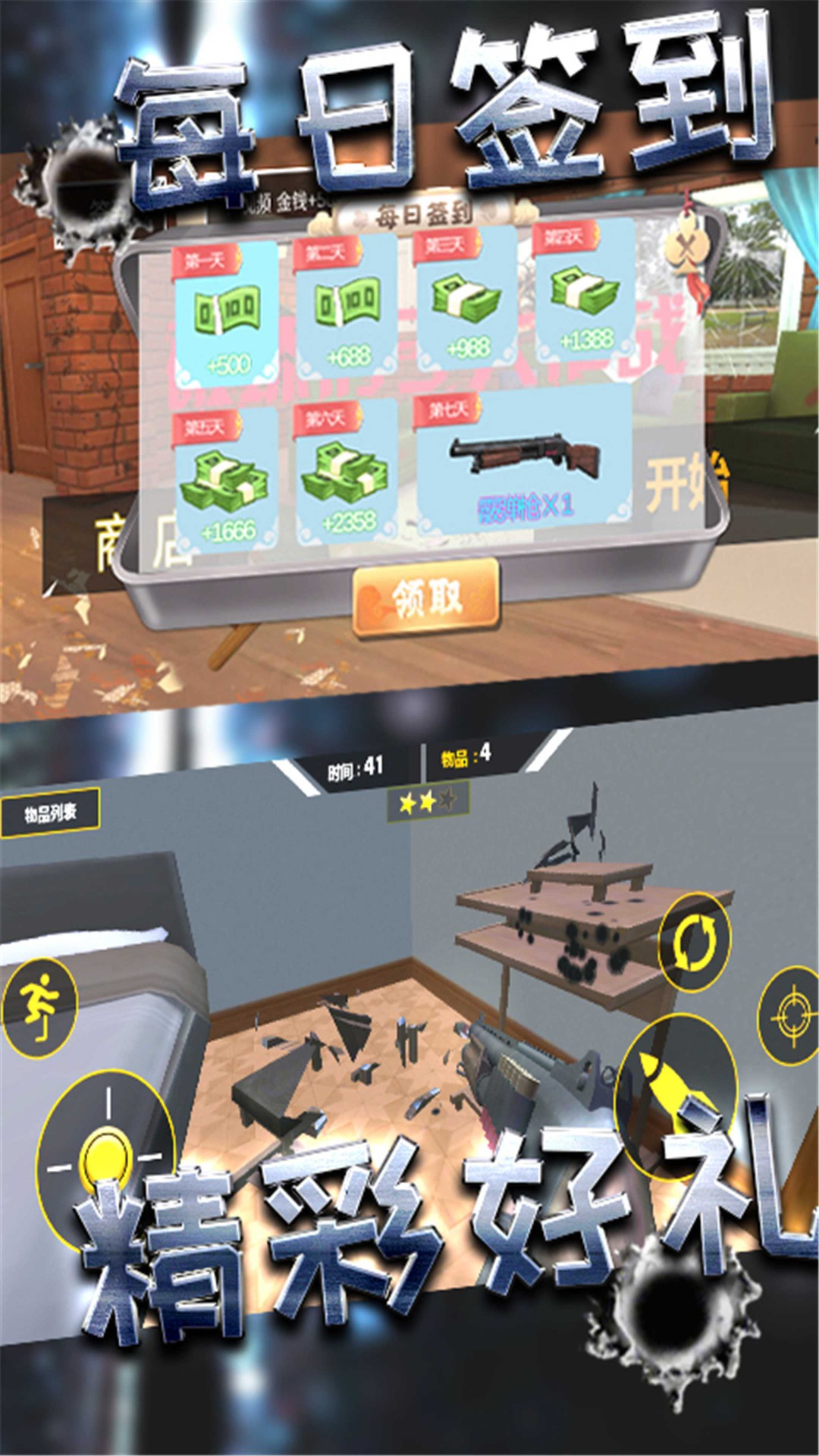 《破坏小当家》游戏里的玩法还是很解压的,你可以在里面使用更多的武器来射击,去将你看到的物品给全部击碎。游戏画面都是3D的,这能让玩家有更好的代入感,每日签到还可以获得奖励,有机会领取更暴力的武器。你在里面要火力全开,让自己更好的去发泄。