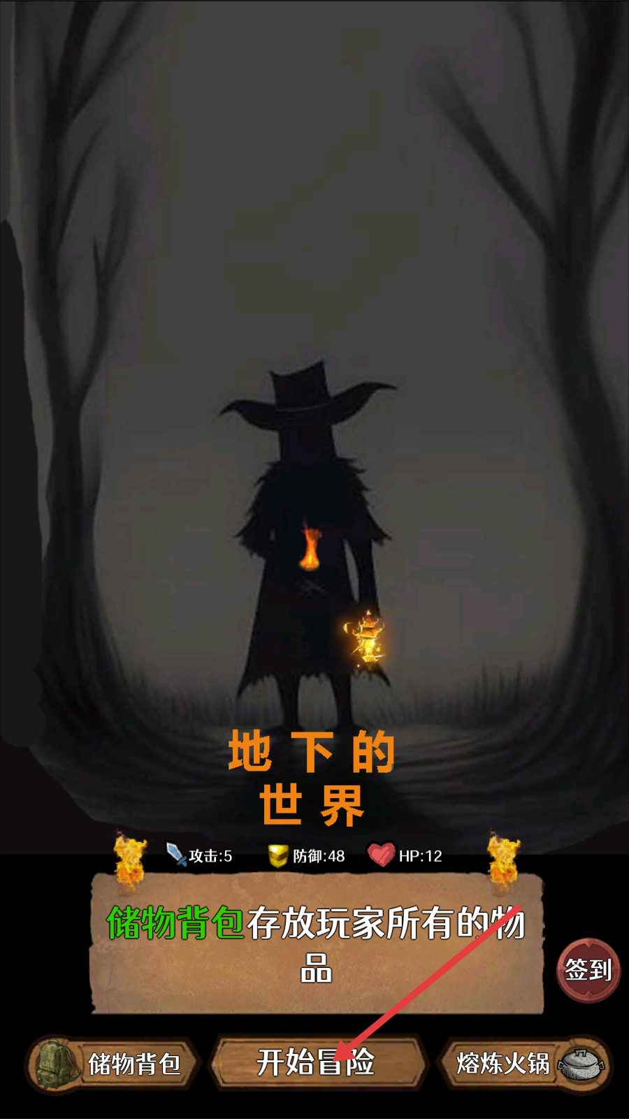 1、进入“地下的世界”,确认攻击-5、防御-48、HP-12的属性后,点击【开始冒险】,前往祭月荒原探索。