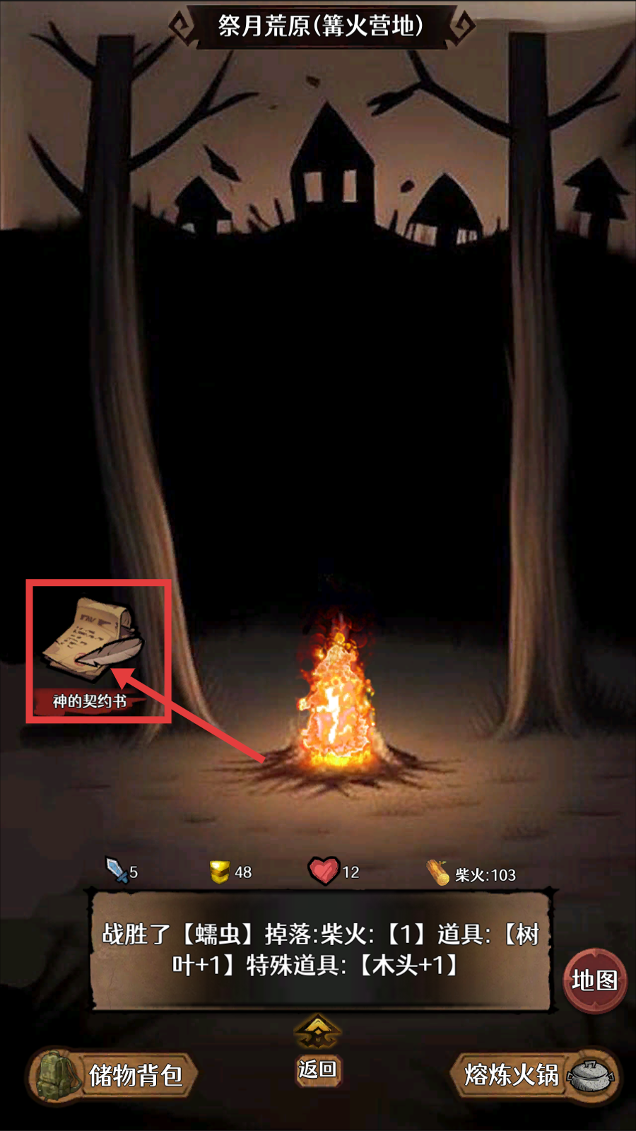 2、在“祭月荒原(篝火营地)”场景中,找到【神的契约书】,它是触发特殊事件的核心道具,可开展后续交互。