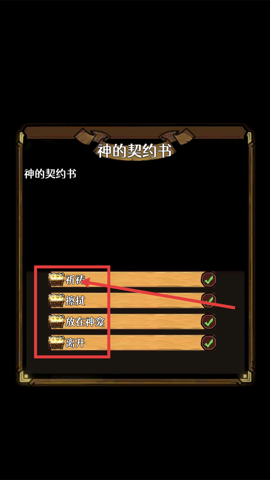 3、打开【神的契约书】,选择【祈祷】【擦拭】【放在神龛】或【离开】等交互选项,不同选择会触发不同游戏事件。