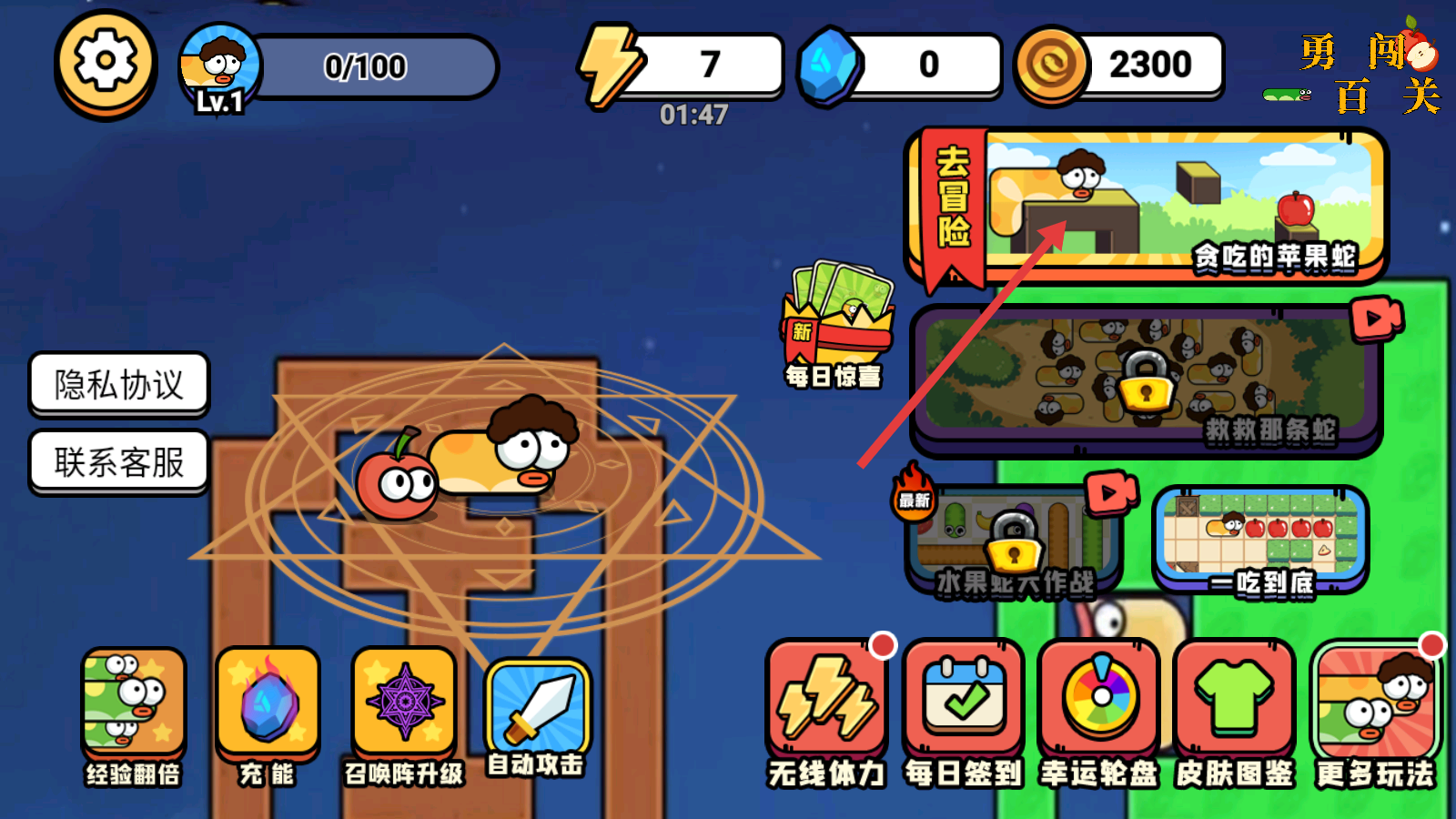 1、进入游戏后,点击【贪吃的苹果蛇】去冒险,同时可留意【经验翻倍】【充能】等功能,为后续闯关助力。