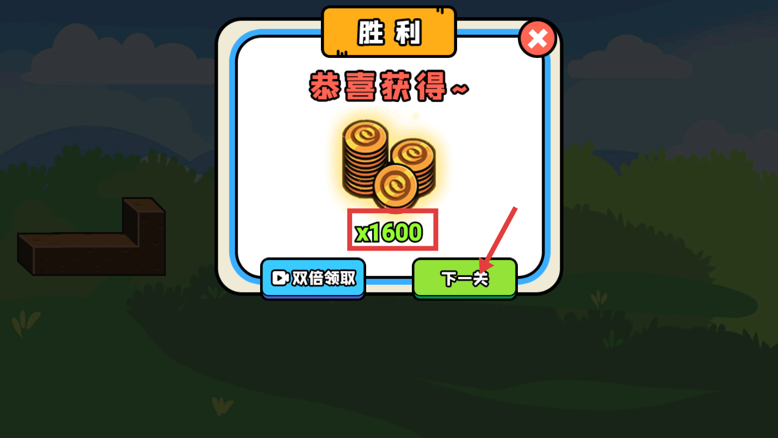 4、成功通关后,会获得【x1600】金币奖励,点击【下一关】按钮,继续挑战后续关卡。