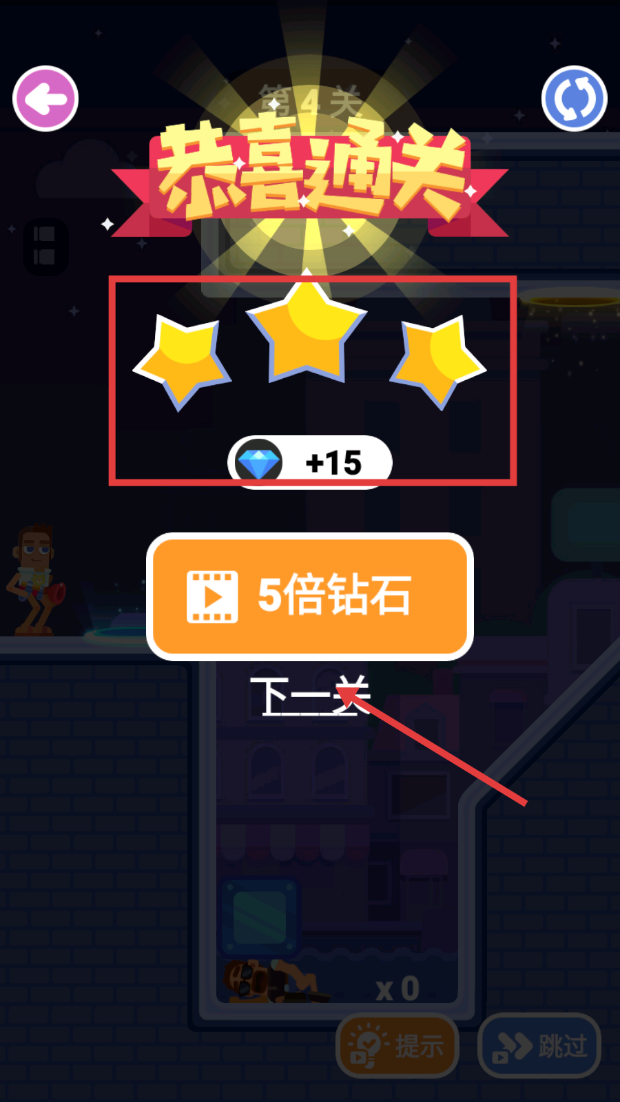 4、成功通关后,会获得三星评价和+15钻石,还能看视频领5倍钻石,之后点【下一关】继续。