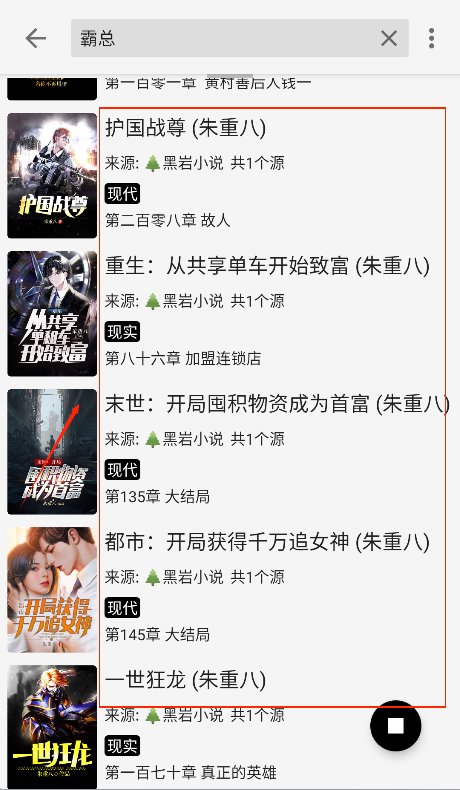2、通过搜索功能输入关键词比如"霸总",会显示相关小说列表,每本书都配有封面图并标注来源平台和分类标签,还能看到最新章节信息。