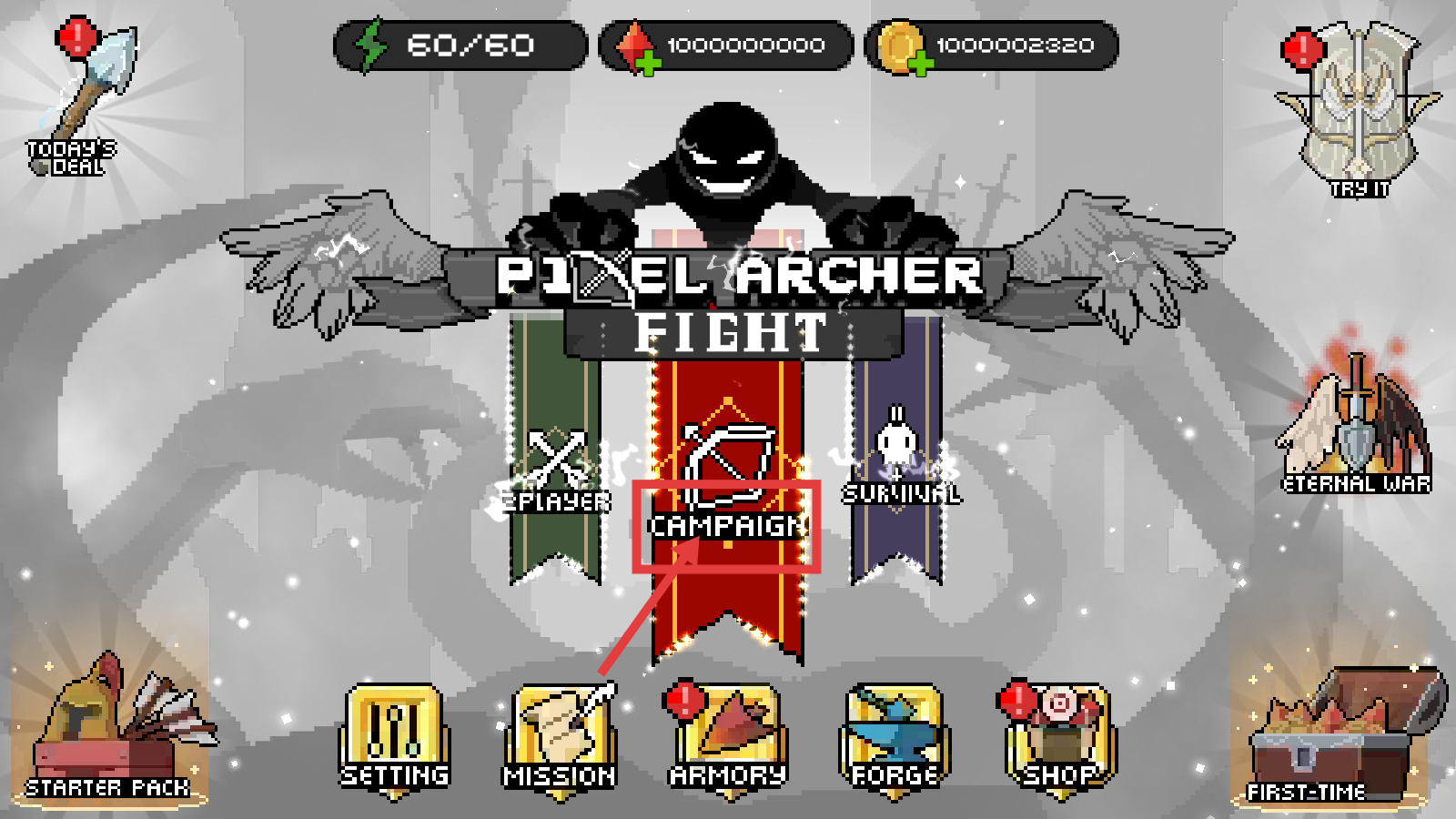 1、进入《PixelArcherFight》游戏,选择【CAMPAIGN】(战役)模式,开启冒险关卡。