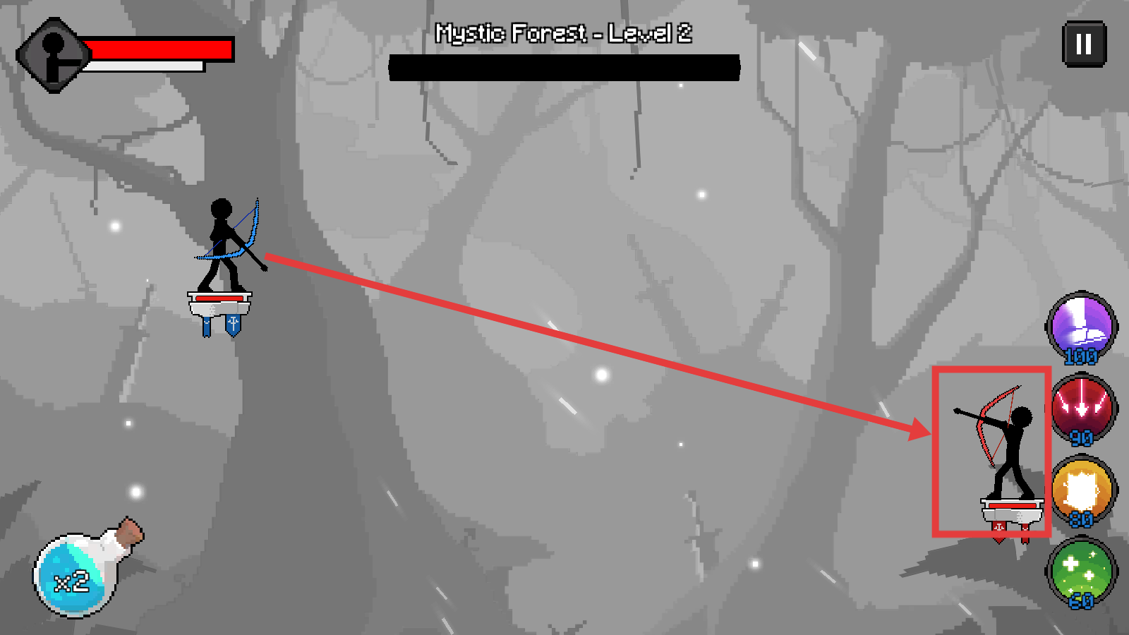 2、在关卡(如“MysticForestLevel2”)中,操控己方弓箭手,瞄准敌方弓箭手等目标发起攻击。