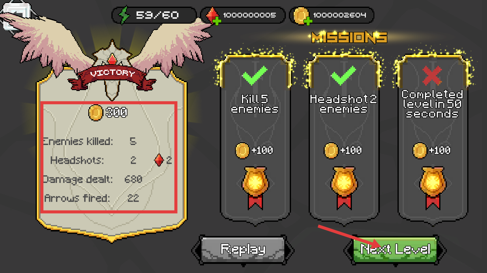 4、成功击败敌人后,会获得金币、钻石等奖励,点击【NextLevel】可进入下一关继续挑战。