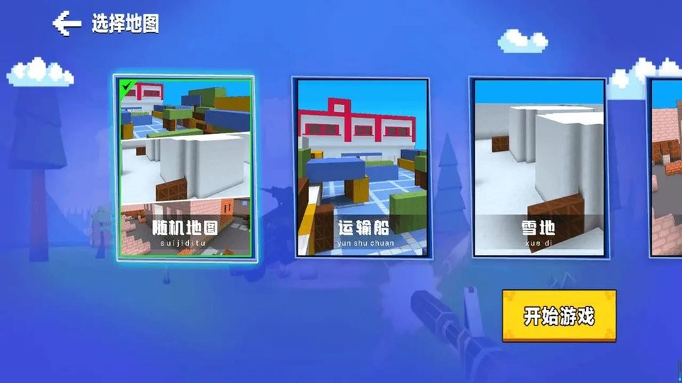 2、如何选择地图?在地图选择界面,点击“开始游戏”按钮,选择随机地图、运输船或雪地开始游戏。