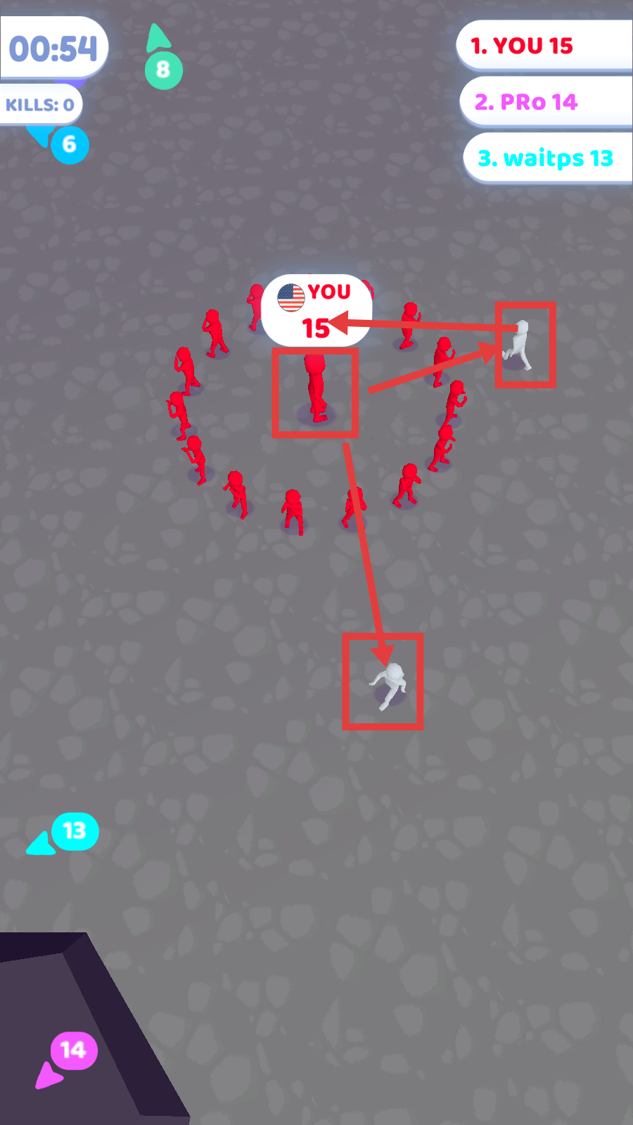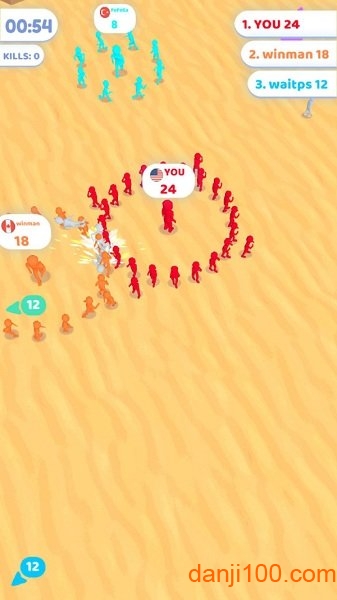 2、冒险中关注左上角时间与kills数,操控【YOU】的人群追击白色小人,快速增加己方人数,提升排名。