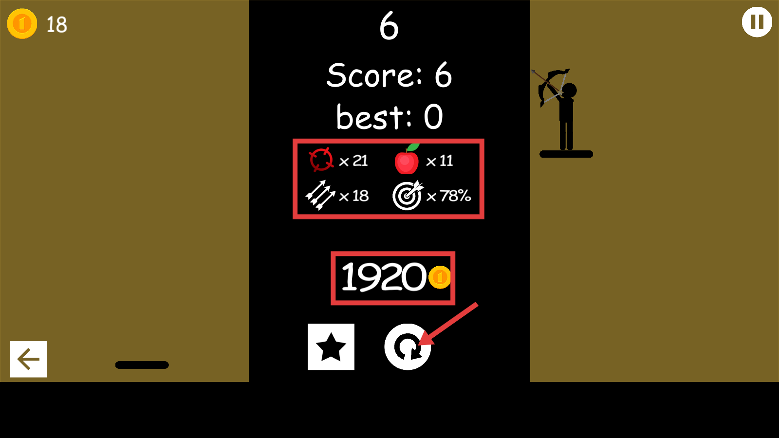 4、关卡结束后,查看结算界面的【Score-6】【1920-金币】等奖励,点击重新开始按钮可再次挑战。