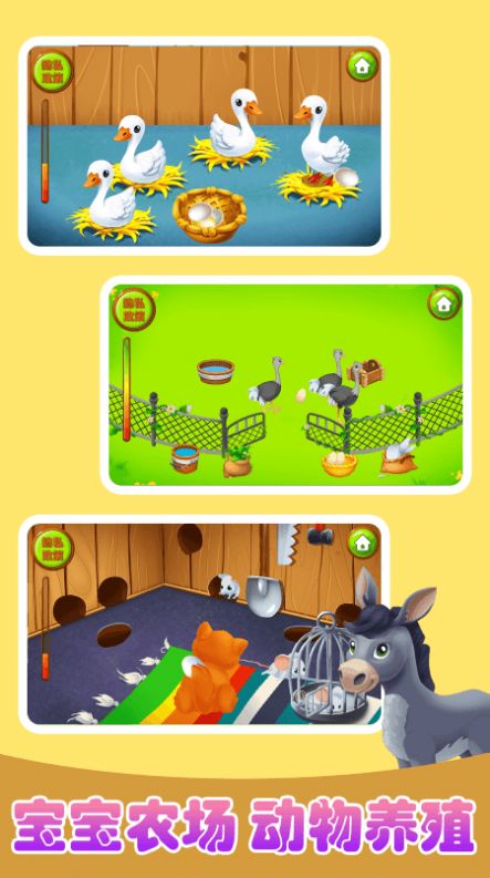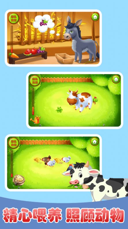 3、宝宝欢乐农场这款游戏可以激发孩子的创造力、想象力,帮助宝宝健康快乐的成长。