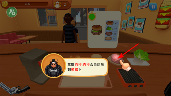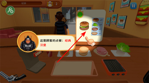 1、查看顾客的点餐提示如经典汉堡,明确需要制作的汉堡组成,完成订单基础,识别食材要求。