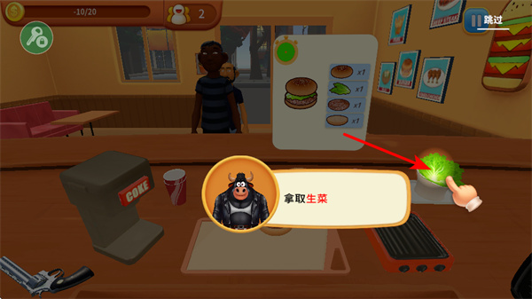 4、拿取生菜,生菜是汉堡的配菜食材,按订单要求依次添加,完成汉堡的组装,交付给顾客获取收益。