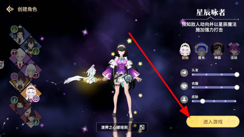 1、创建角色选择不同的角色形象,还能对头发、衣服、皮肤等进行调整,完成角色设置后,点击进入游戏,即可开启冒险之旅。