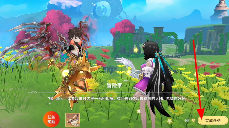 2、进入游戏后,会遇到NPC,与NPC对话,根据提示推进任务,任务完成后,点击完成任务,可获取任务奖励,助力角色成长。