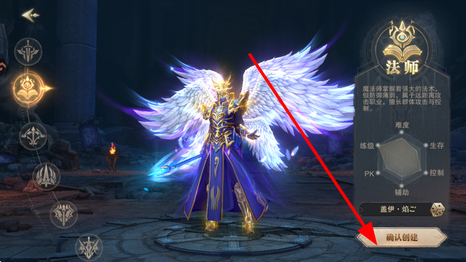 1、进入游戏后,创建法师等职业,了解特点后,点击确认创建,就能开启属于自己的冒险之旅,不同职业发展与战斗方式有所不同。