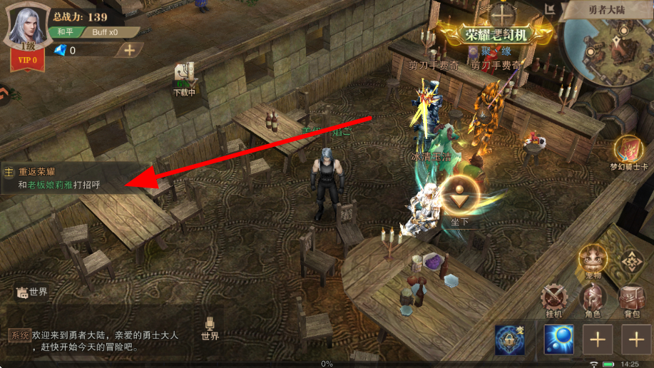 2、勇者大陆等场景,会有诸如和老板娘雅莉打招呼这类任务,与指定NPC互动完成任务,可获取经验、道具等奖励,推动角色成长。