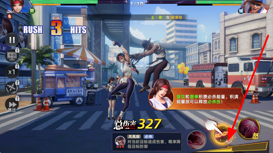 3、通过普攻和重拳攻击对手,积攒必杀能量,当必杀能量积满时,能释放必杀技,必杀技往往能对对手造成大量伤害,扭转战局。
