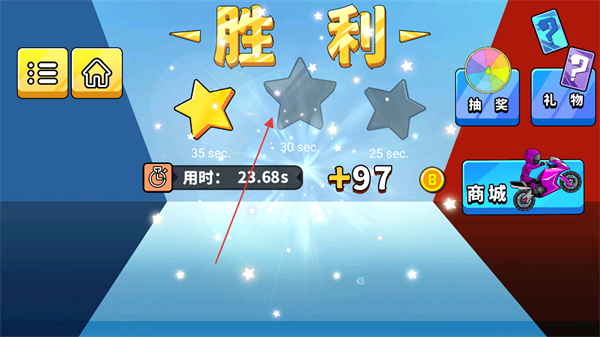 4、到达终点后,依据用时获得星级评价,可点击界面继续挑战新关卡。