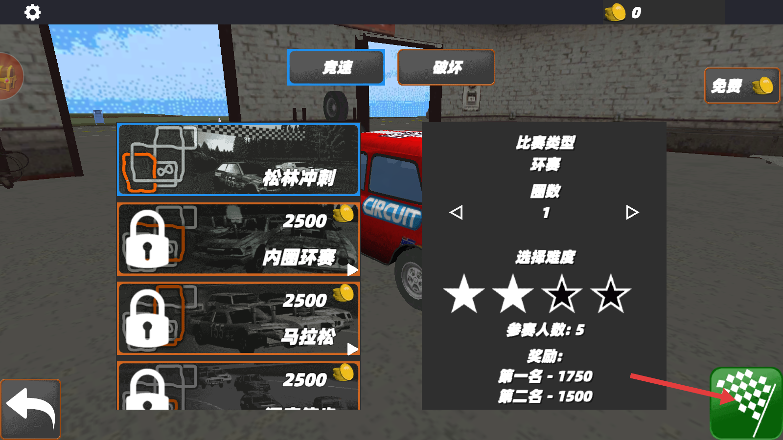 1、进入游戏后,选择【松林冲刺】赛道,确认比赛类型为环赛、圈数1等设置,点击绿色旗帜图标开始比赛。
