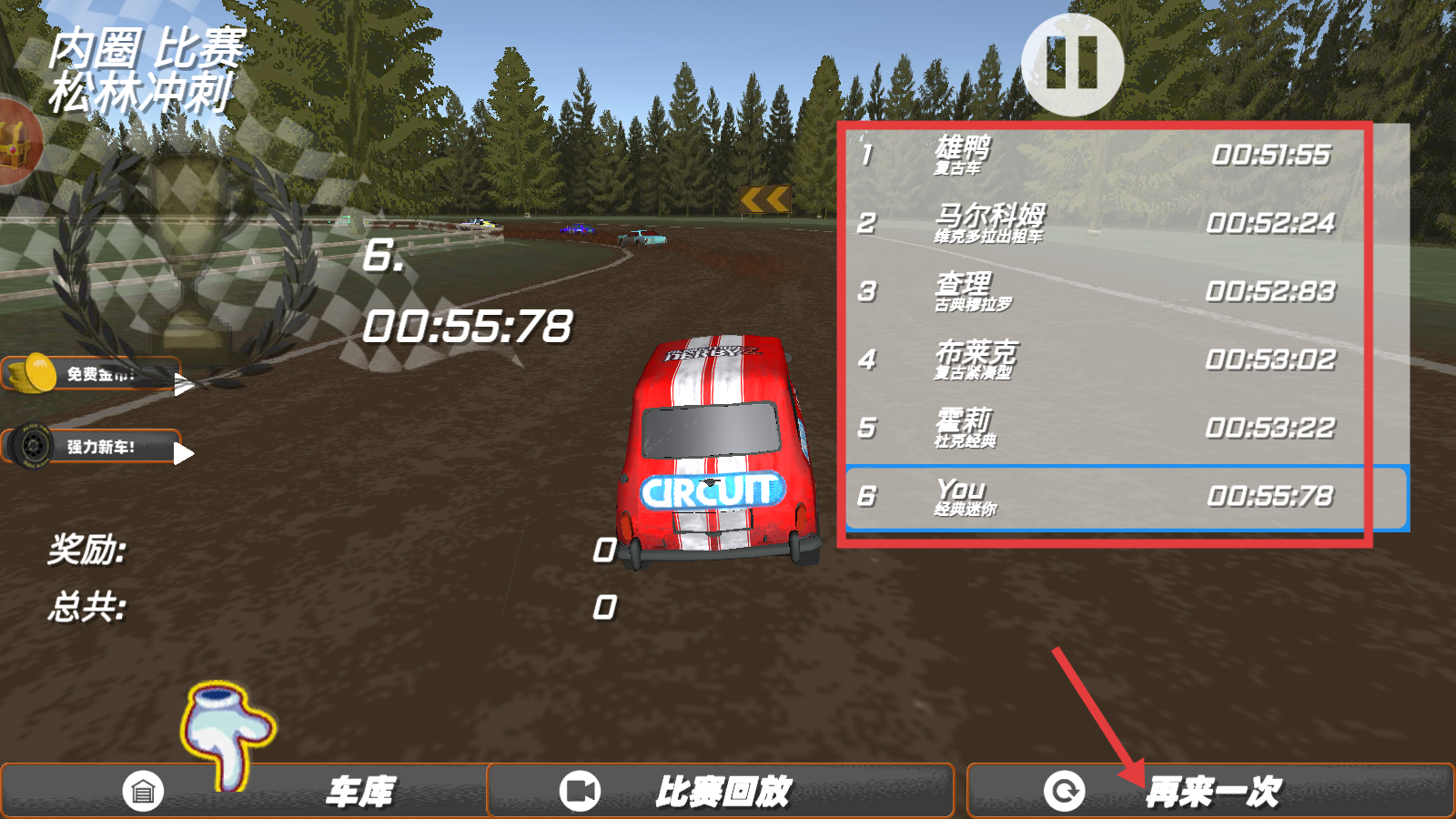4、比赛结束后,若成绩不理想,可点击“再来一次”按钮,重新挑战【松林冲刺】赛道以争取更好名次。