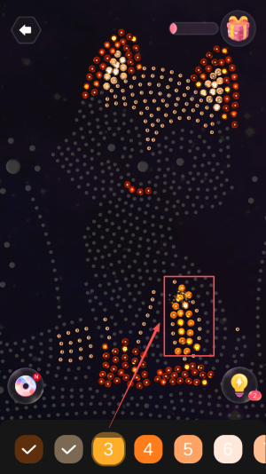 2、按提示填水钻:观察图画上的颜色提示,从色板中挑选对应颜色的水钻,点击图画对应区域完成填充,逐步勾勒图案轮廓。