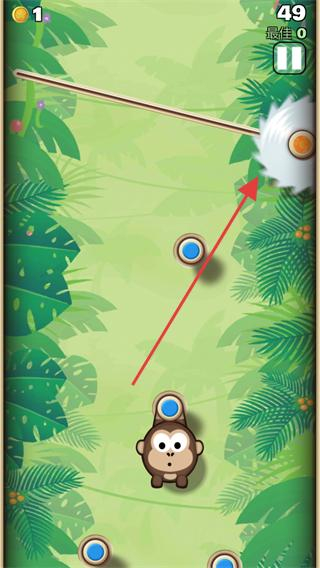 1、进入游戏,操控小猴子移动,让小猴子触碰蓝色圆点,借助圆点反弹向上移动,避开红色圆点。