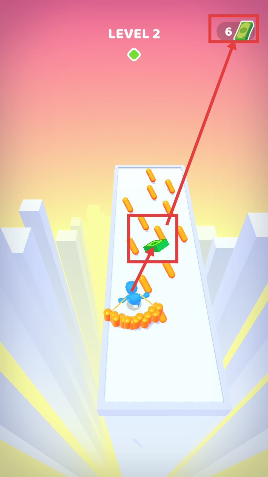 2、前进时留意路径上的绿色物品,收集它们能让右上角金币数量增加,要尽量获取这些绿色钞票。