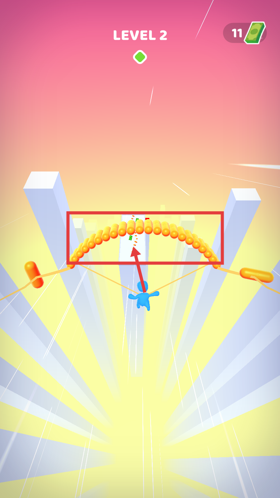 3、利用路途中收集到的【黄色道具】形成的滑翔翼,飞跃过前方的悬空区域,到达拥有【绿色钞票】的白色地块上。