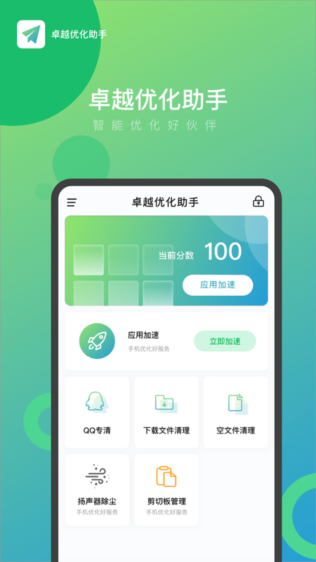 2、卓越优化助手app的帮助用户完成手机一键清洁加速,有许多人性化的清洁功能。