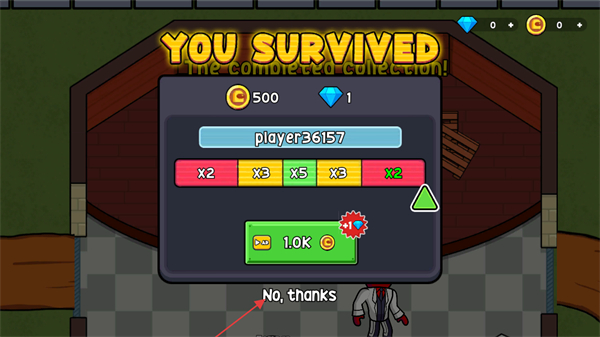4、成功收集完所有目标物品后,出现YOUSURVIVED提示,可选择领取奖励或点击No,thanks退出结算界面。