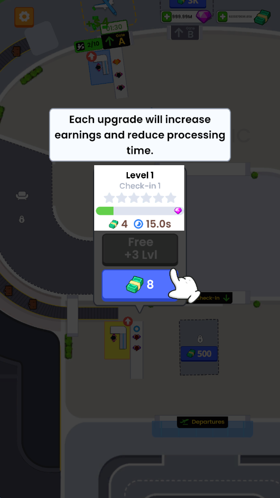 3.玩家可以解锁更大的机场地图,并通过扩建机场来容纳更多的设施和航班,扩建机场需要消耗资源和金币,但可以为玩家带来更高的收益和成就感;