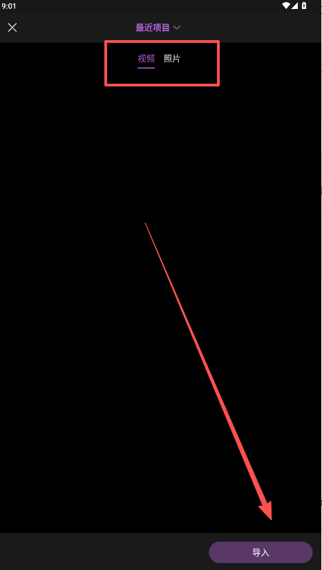 3、从设备现有的视频图片中找到想要编辑制作的内容部分,点击“导入”。
