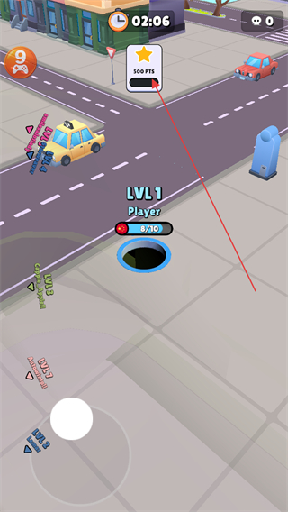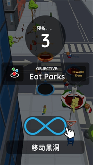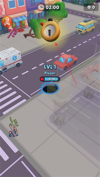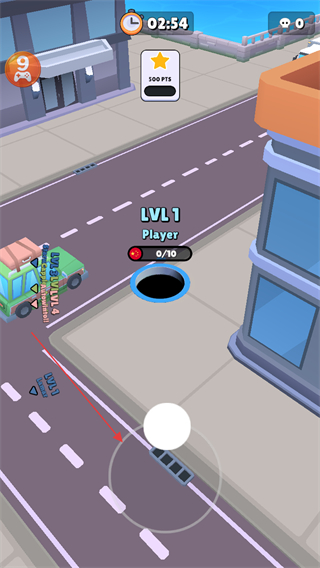3、在规定时间内,不断移动黑洞,吞噬更多物品提升等级和进度,同时注意躲避车辆。