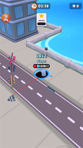 2、操控黑洞吞噬道路上的物品,像垃圾桶等,屏幕中间显示当前等级LVL1及吞噬进度0/10。