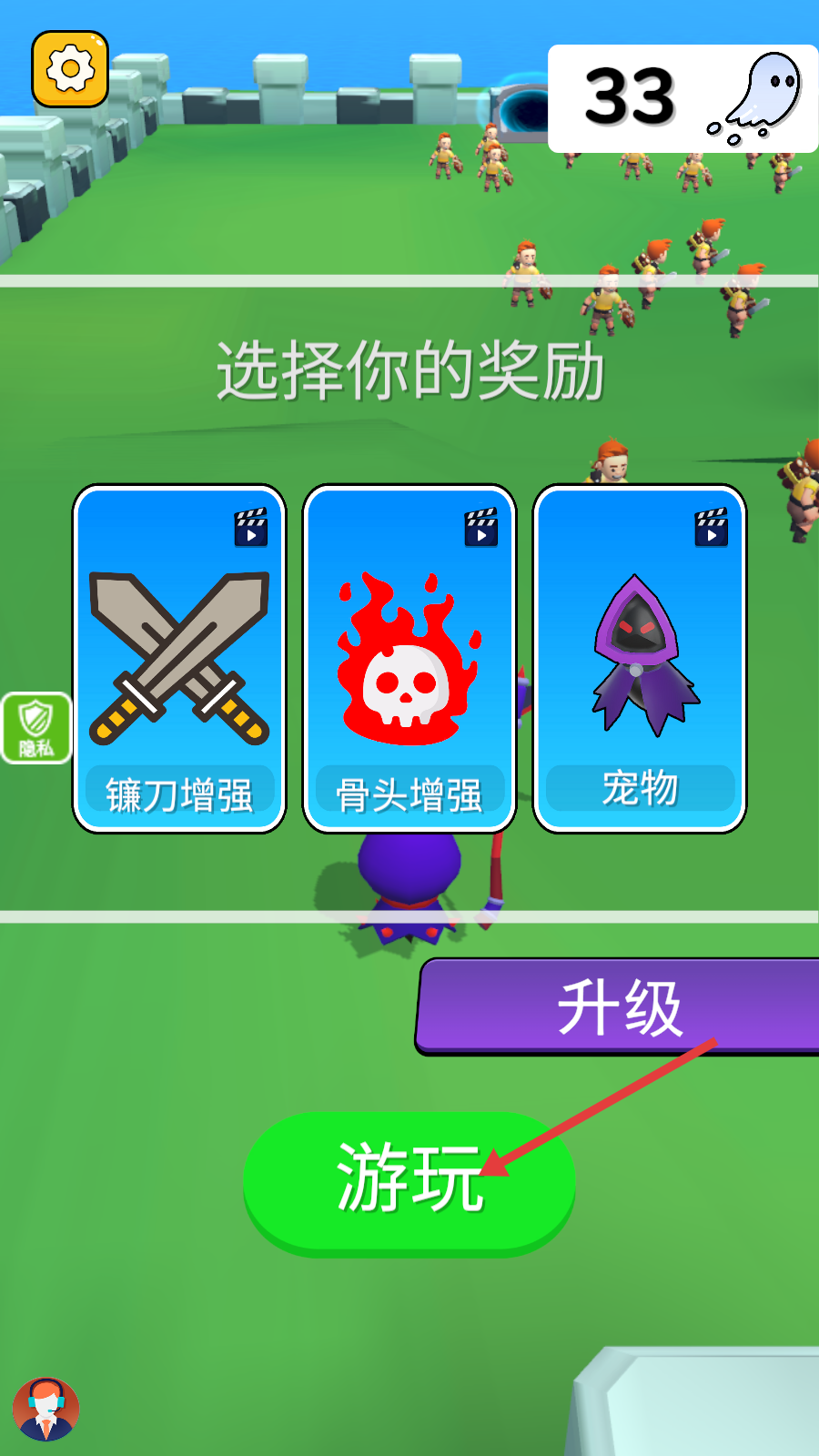 1、选择奖励时,可依据需求选【镰刀增强】【骨头增强】或【宠物】,选好后点击【游玩】进入战斗。