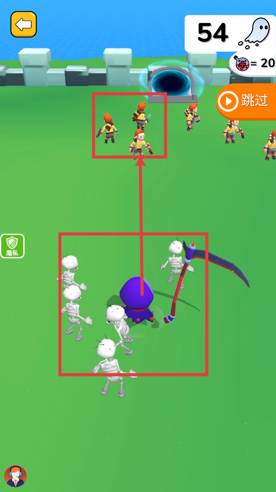 3、利用召唤的骷髅随从协助战斗,分散敌人注意力,同时自身瞄准敌人输出,逐步推进战局。