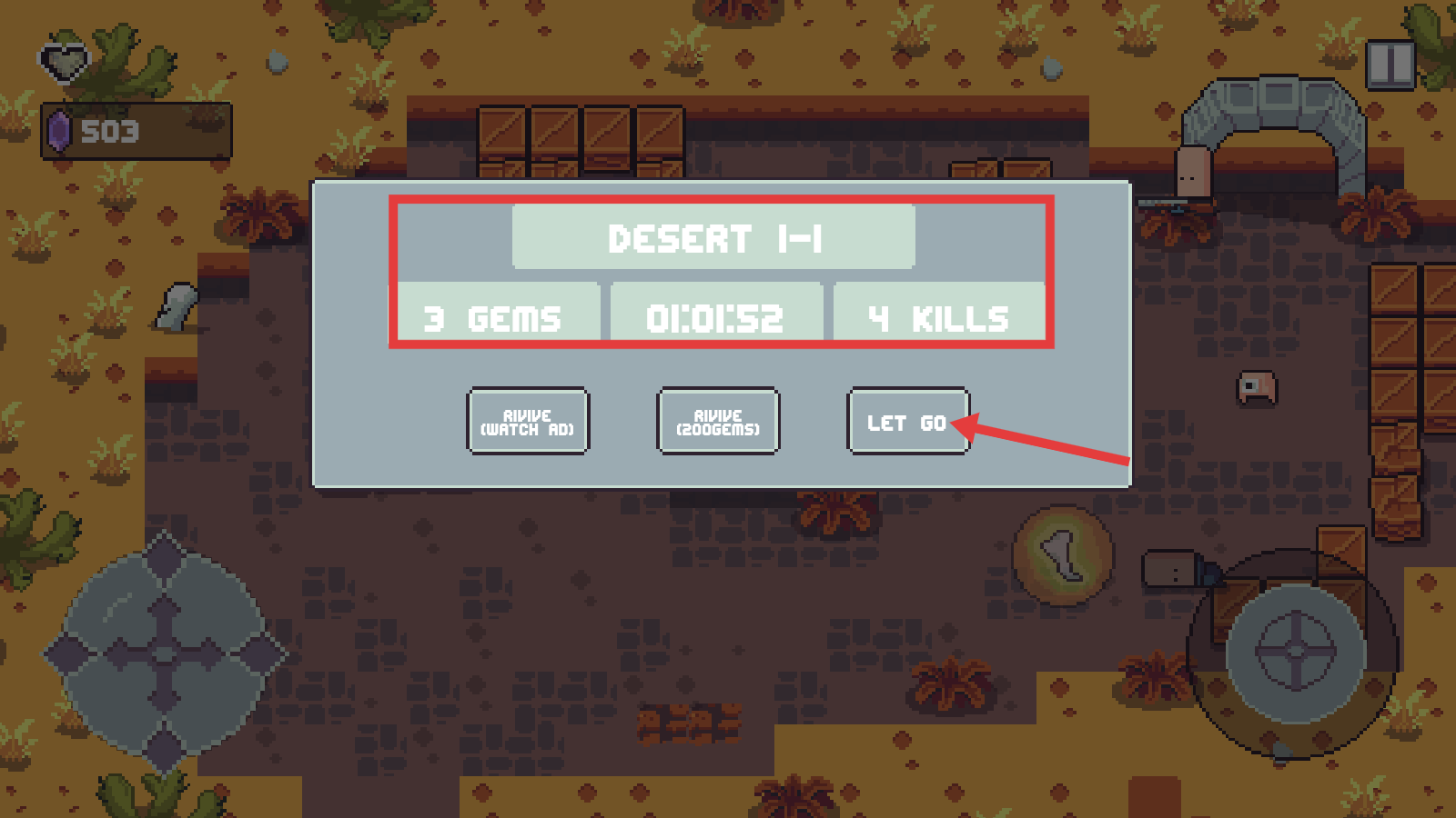 4、关卡结束后,查看【DESERT-1-1】的结算界面,了解获得的宝石数、用时和击杀数,选择【LET-GO】可结束本关。