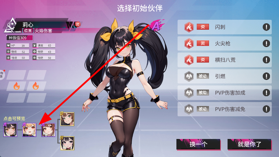 2、挑选初始伙伴中,点击不同伙伴头像预览,了解其技能等信息,选好后点击就是你了,确定初始伙伴。