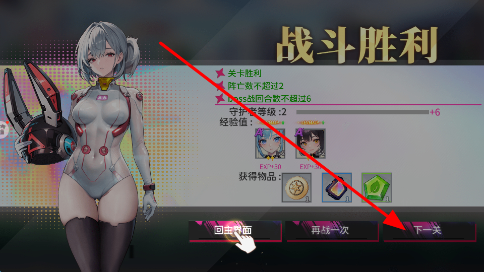 4、关卡胜利后,根据需求选择回主界面、再战一次或下一关,点击下一关,就能继续挑战新的关卡。